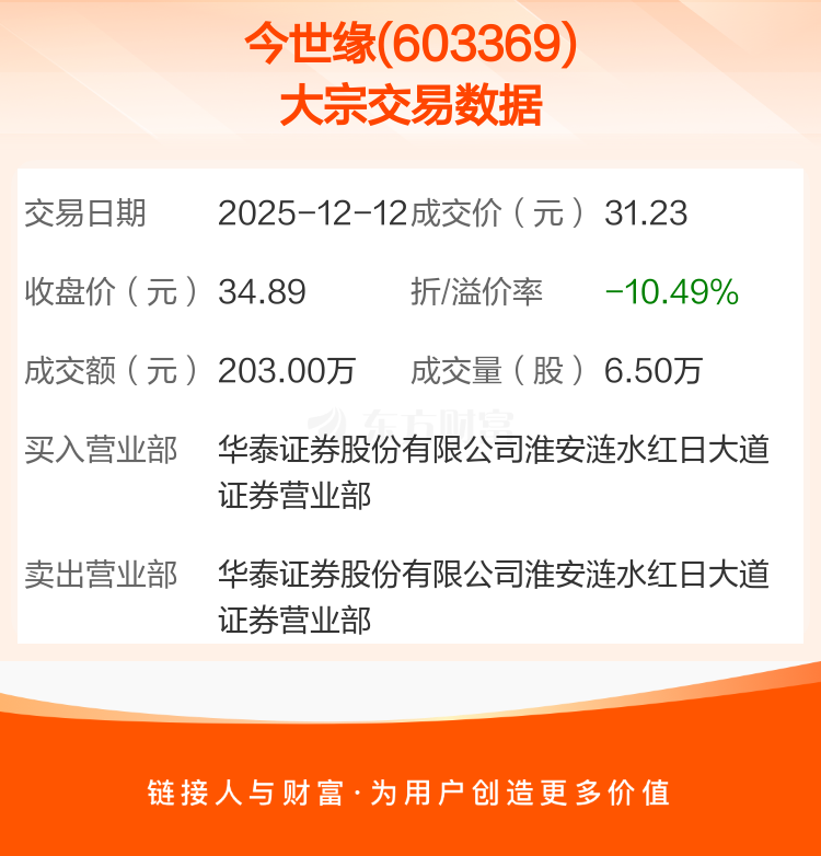 2025年12月12日,今世缘发生1笔大宗交易,共成交6.50万股,成交金额203.00万元,占其流通市值比例为0.00%。
