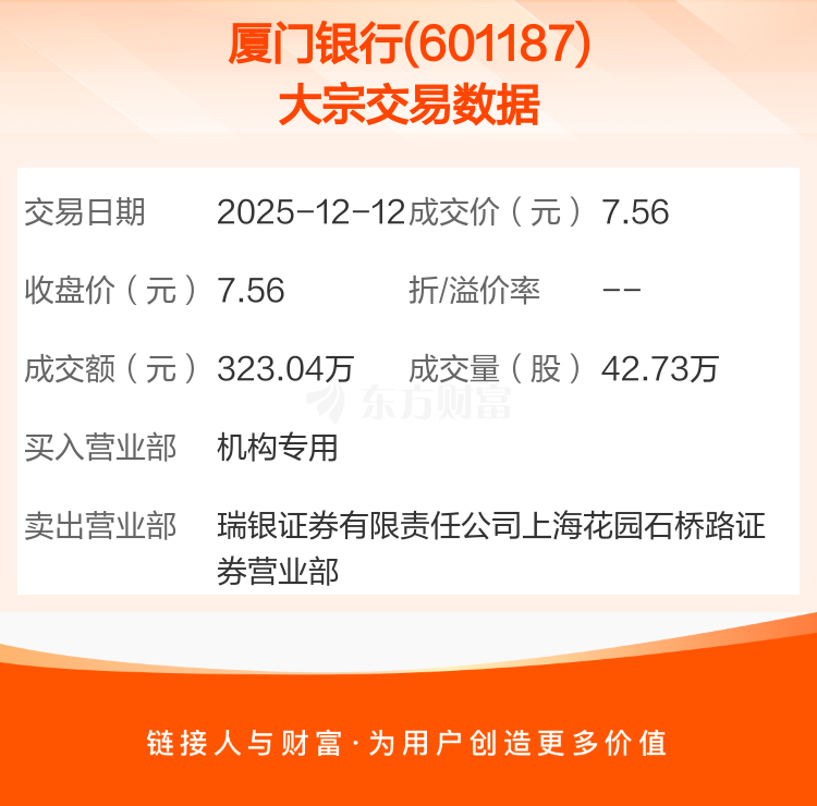 2025年12月12日,厦门银行发生1笔大宗交易,共成交42.73万股,成交金额323.04万元,占其流通市值比例为0.02%。