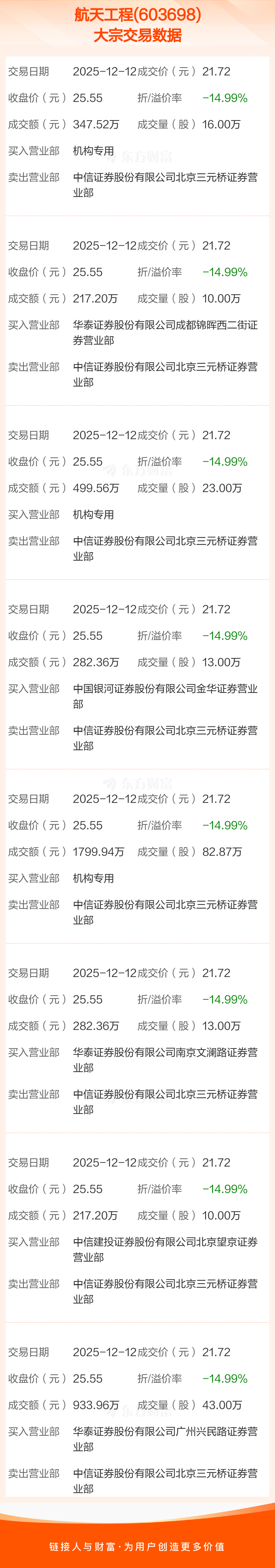 2025年12月12日,航天工程发生8笔大宗交易,共成交210.87万股,成交金额4580.10万元,占其流通市值比例为0.33%。