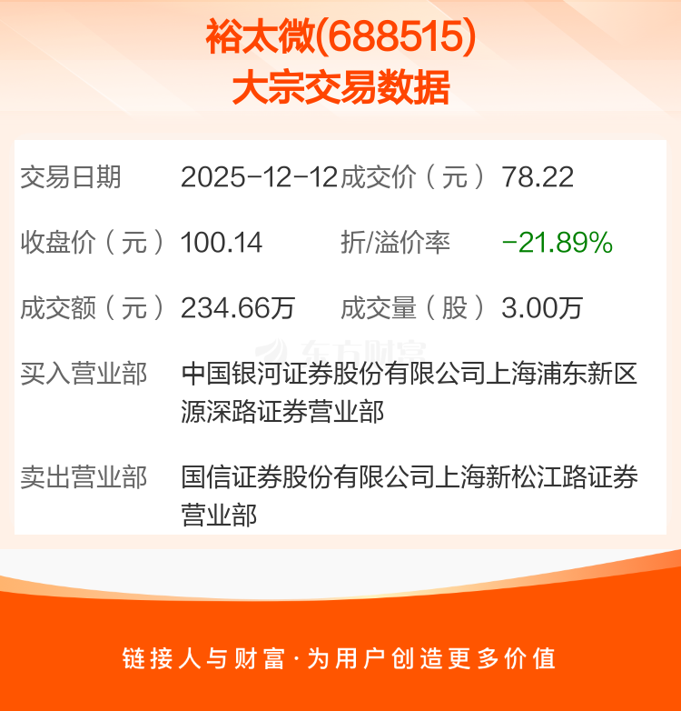 大宗交易:裕太微成交234.66万元,折价21.89%(12-12)