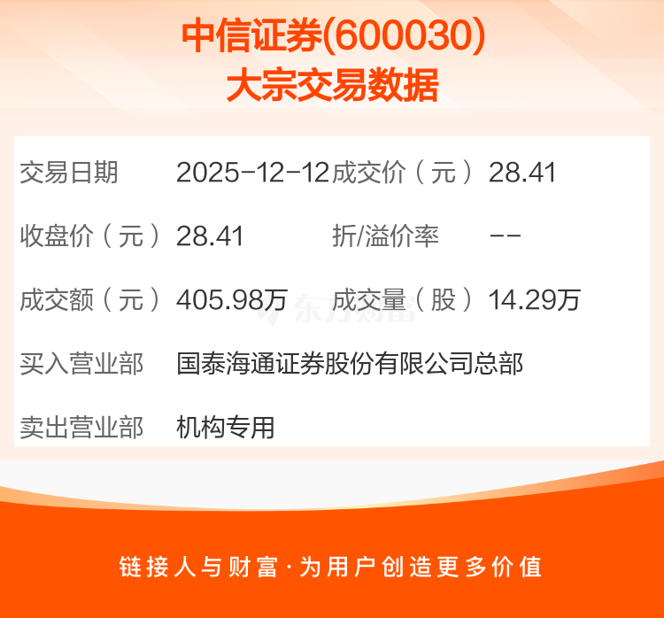2025年12月12日,中信证券发生1笔大宗交易,共成交14.29万股,成交金额405.98万元,占其流通市值比例为0.00%。