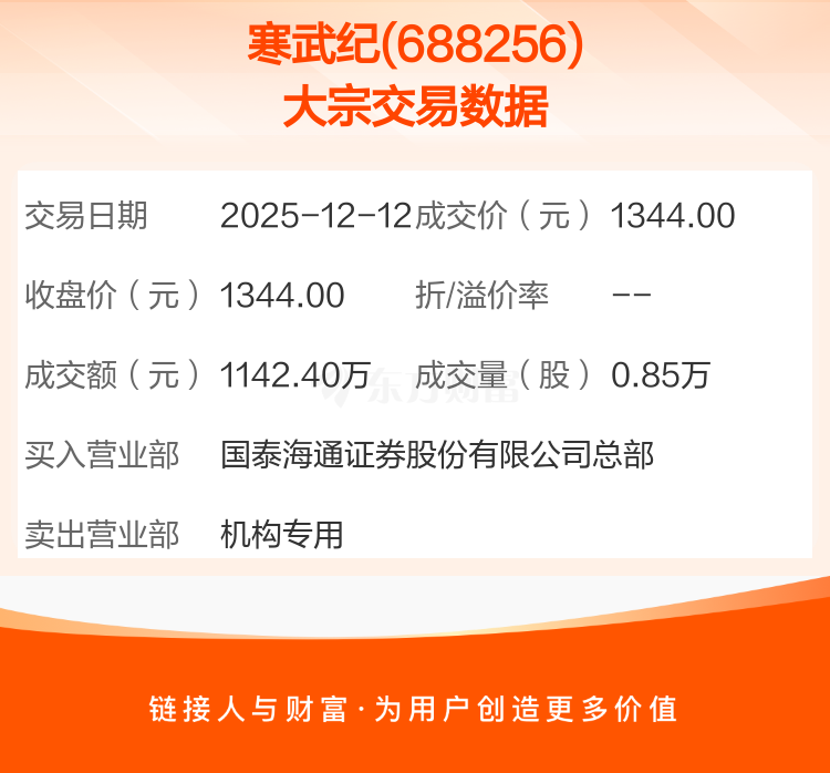 2025年12月12日,寒武纪发生1笔大宗交易,共成交8500股,成交金额1142.40万元,占其流通市值比例为0.00%。