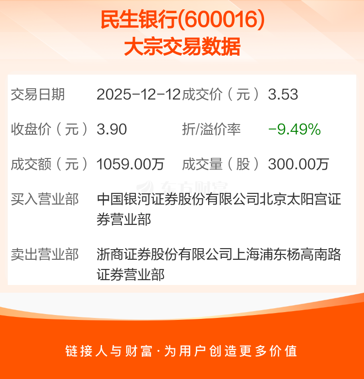 2025年12月12日,民生银行发生1笔大宗交易,共成交300.00万股,成交金额1059.00万元,占其流通市值比例为0.01%。