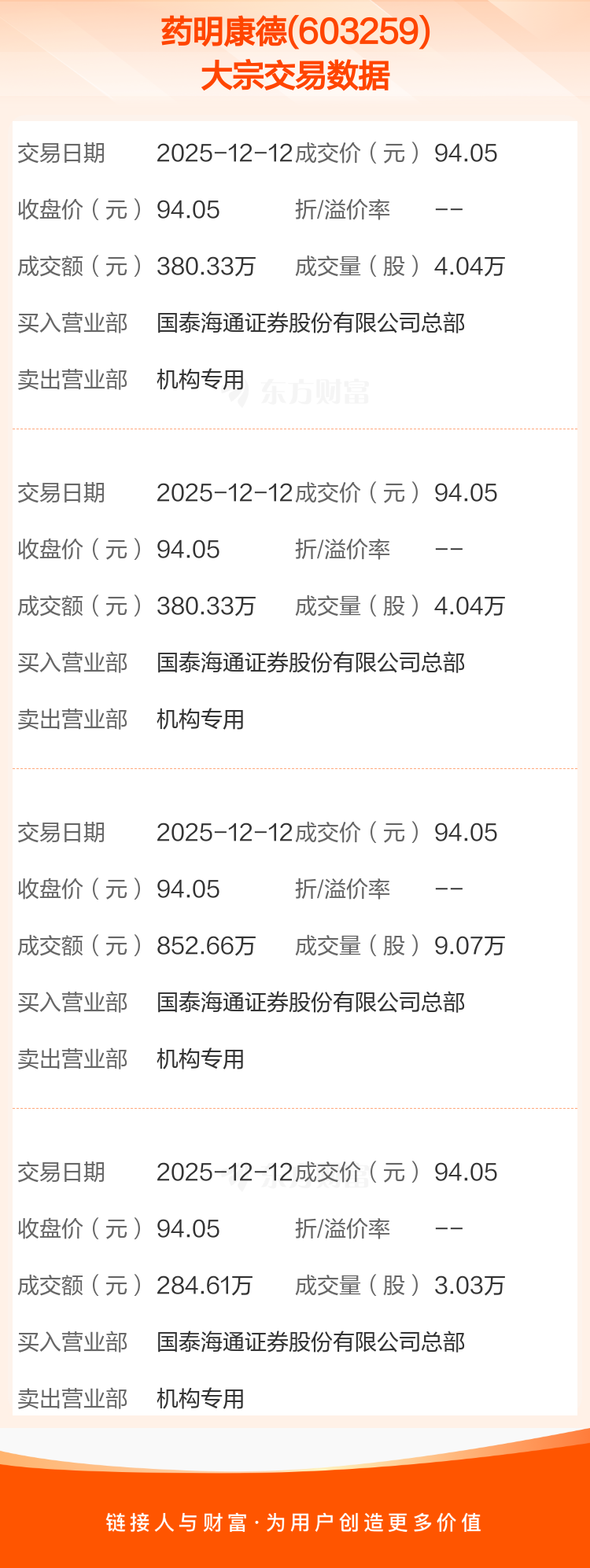4笔大宗交易成交均价94.05元,较该股当日收盘价94.05元持平。