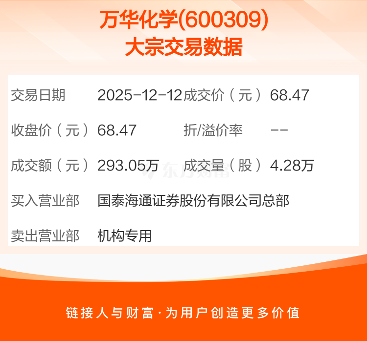 2025年12月12日,万华化学发生1笔大宗交易,共成交4.28万股,成交金额293.05万元,占其流通市值比例为0.00%。
