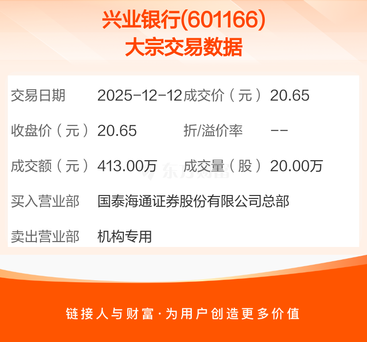 2025年12月12日,兴业银行发生1笔大宗交易,共成交20.00万股,成交金额413.00万元,占其流通市值比例为0.00%。