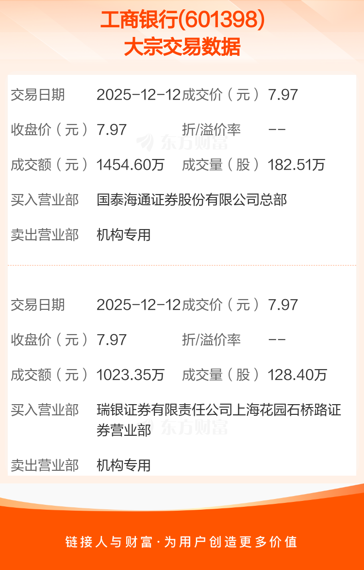 2025年12月12日,工商银行发生2笔大宗交易,共成交310.91万股,成交金额2477.95万元,占其流通市值比例为0.00%。