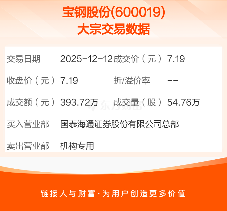 2025年12月12日,宝钢股份发生1笔大宗交易,共成交54.76万股,成交金额393.72万元,占其流通市值比例为0.00%。