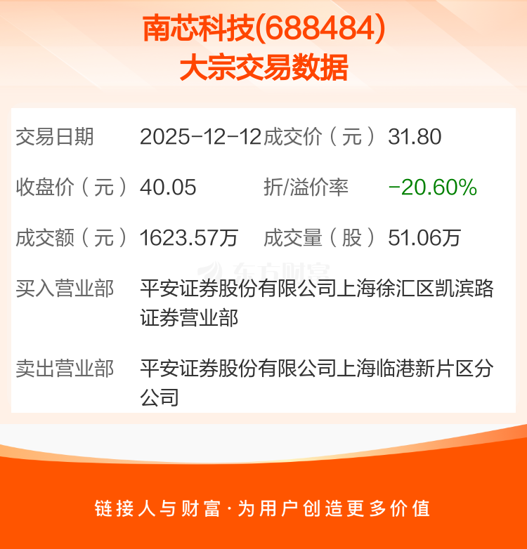 大宗交易:南芯科技成交1623.57万元,折价20.60%(12-12)