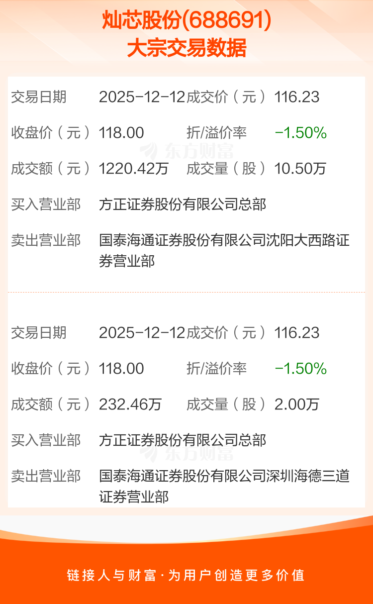 2025年12月12日,灿芯股份发生2笔大宗交易,共成交12.50万股,成交金额1452.88万元,占其流通市值比例为0.17%。