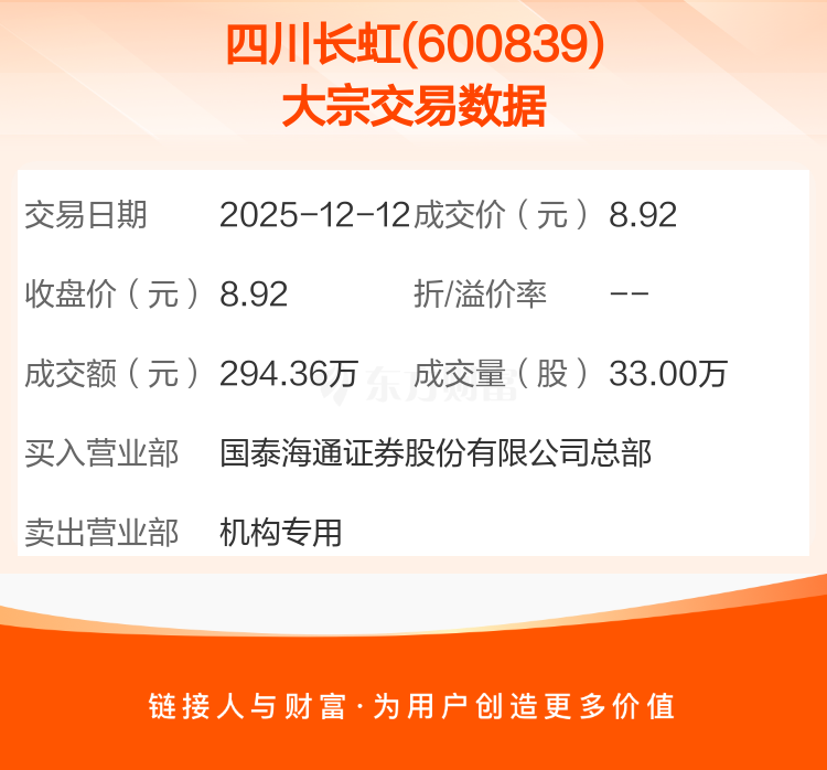 2025年12月12日,四川长虹发生1笔大宗交易,共成交33.00万股,成交金额294.36万元,占其流通市值比例为0.01%。