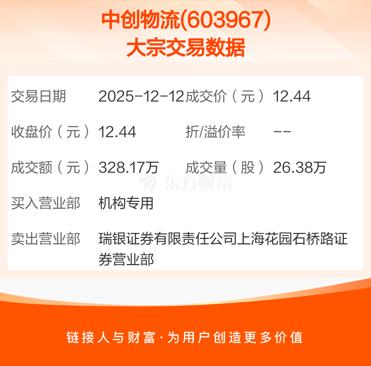 2025年12月12日,中创物流发生1笔大宗交易,共成交26.38万股,成交金额328.17万元,占其流通市值比例为0.08%。