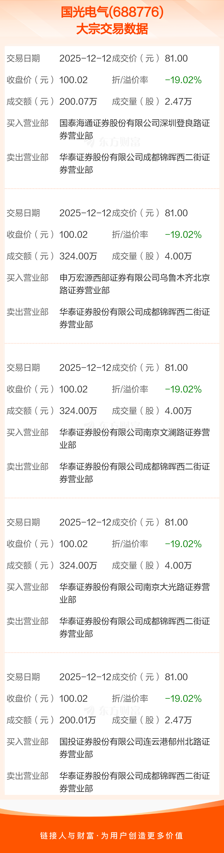 2025年12月12日,国光电气发生5笔大宗交易,共成交16.94万股,成交金额1372.08万元,占其流通市值比例为0.13%。