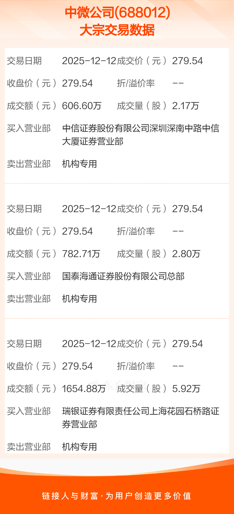2025年12月12日,中微公司发生3笔大宗交易,共成交10.89万股,成交金额3044.19万元,占其流通市值比例为0.02%。