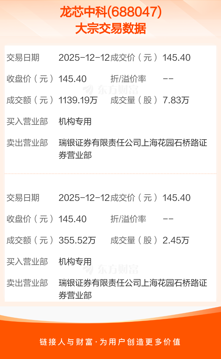 2025年12月12日,龙芯中科发生2笔大宗交易,共成交10.28万股,成交金额1494.71万元,占其流通市值比例为0.03%。