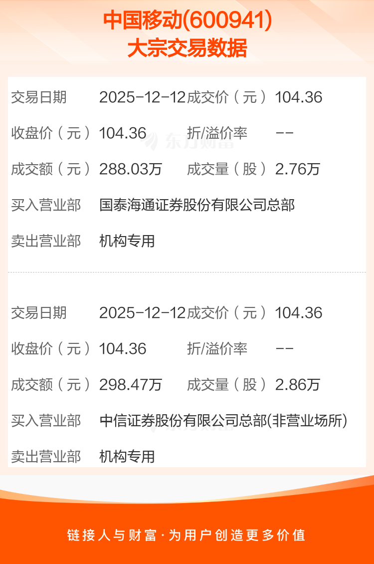 2025年12月12日,中国移动发生2笔大宗交易,共成交5.62万股,成交金额586.50万元,占其流通市值比例为0.01%。