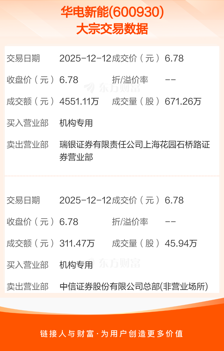 2025年12月12日,华电新能发生2笔大宗交易,共成交717.20万股,成交金额4862.58万元,占其流通市值比例为0.29%。