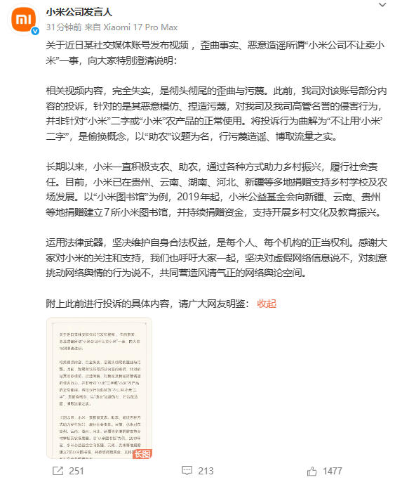 12月12日,小米公司发布声明,称相关视频内容完全失实,是彻头彻尾的歪曲与污蔑。此前,公司对该账号部分内容的投诉,针对的是其恶意模仿、捏造污蔑,对我司及我司高管名誉的侵害行为,并非针对“小米”二字或“小米”农产品的正常使用。将投诉行为曲解为“不让用‘小米’二字”,是偷换概念,以“助农”议题为名,行污蔑造谣、博取流量之实。