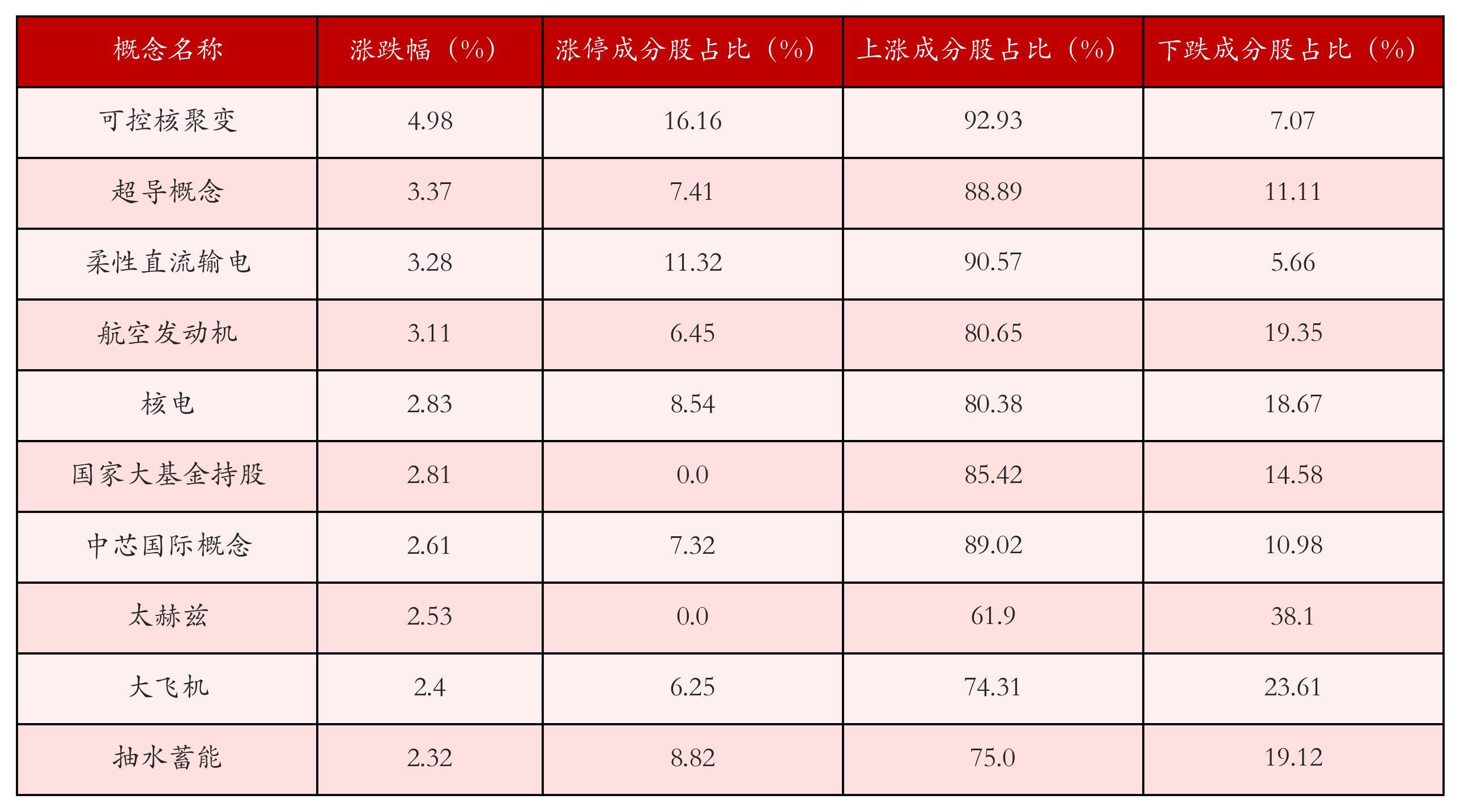 根据A股概念涨跌幅与所对应的股票池综合分析,涨幅靠前的三个概念板块分别为:可控核聚变、超导概念与柔性直流输电。排名前10位的概念板块相关数据见下表: