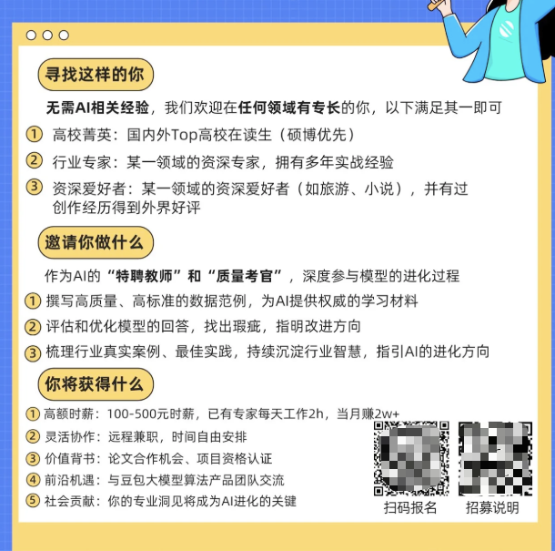 大厂普遍自建标注平台,个人可通过申请进入。以字节为例,其大模型标注与评测平台Xpert在公开招聘中给出的区间是“100—500元/时”,并强调已有专家“每天工作2小时、月入2万+”。准入门槛同样不低:要求国内外TOP 高校在读生,硕博优先。