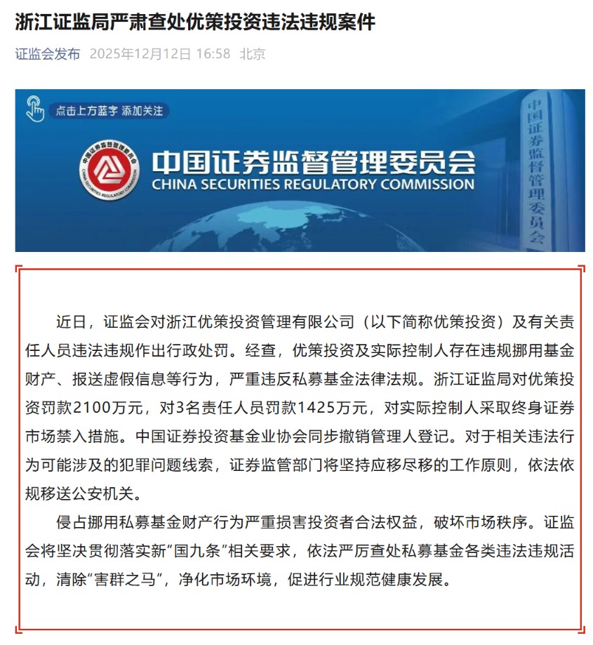 浙江证监局对优策投资罚款2100万元,对3名责任人员罚款1425万元,对实际控制人采取终身证券市场禁入措施。中国证券投资基金业协会同步撤销管理人登记。对于相关违法行为可能涉及的犯罪问题线索,证券监管部门将坚持应移尽移的工作原则,依法依规移送公安机关。