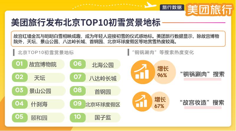 美团旅行发布北京TOP10初雪赏景地标。美团旅行官网截图
