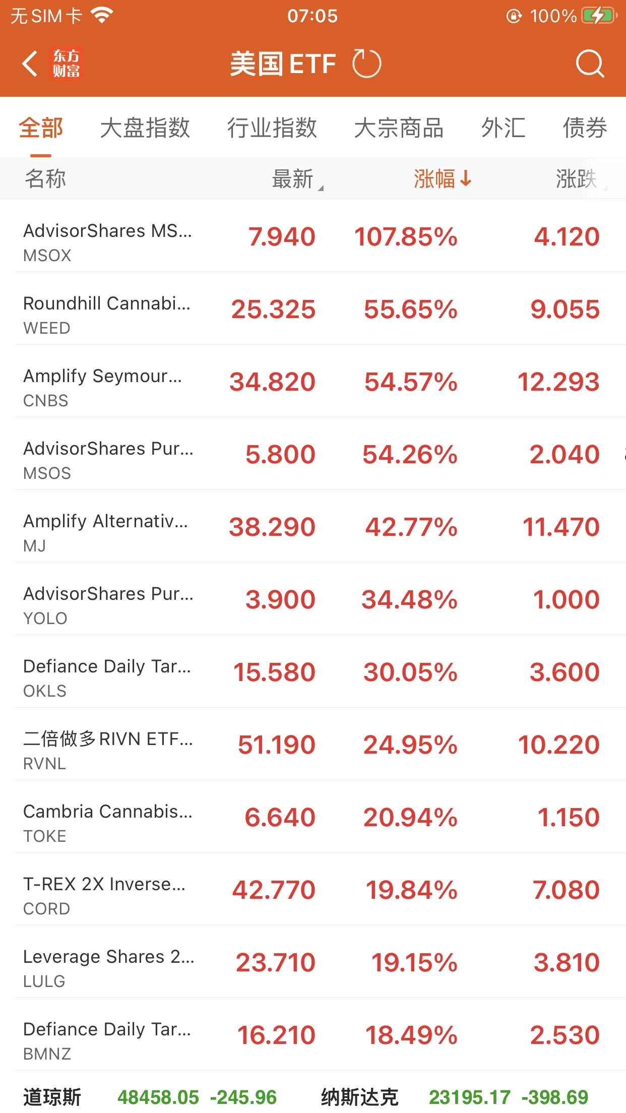 ADVISORSHARES PURE US CANNABIS ETF(MSOS.US) 升54.26%,成交额4.69亿美元。