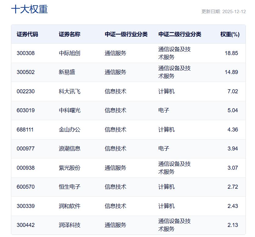 注:上图为中证云人工智能主题指数前十大权重,截至2025年12月12日