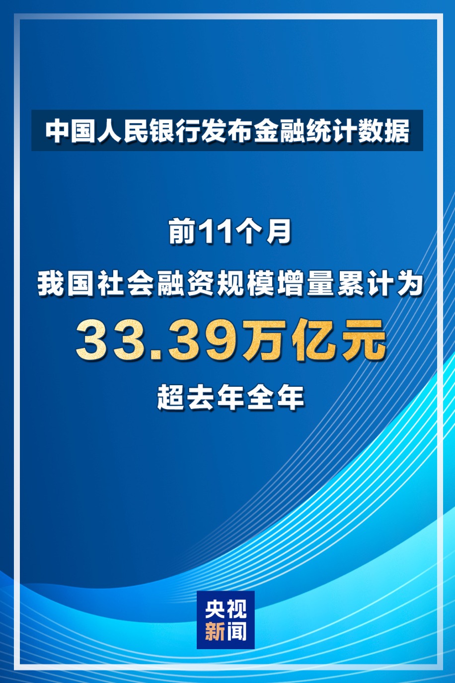 初步统计,2025年前十一个月社会融资规模增量累计为33.39万亿元,超去年全年。