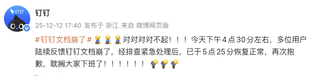 12月12日,钉钉在微博发文回应“文档功能崩了”:今天下午4点30分左右,多位用户陆续反馈钉钉文档崩了,经排查紧急处理后,已于5点25分恢复正常,再次抱歉,“耽搁大家下班了”。
