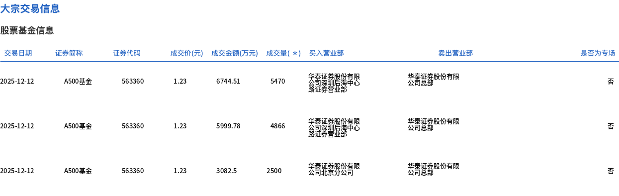 12月12日,A500基金大宗交易成交1.28亿股,成交额1.58亿元,占当日总成交额的1.47%,成交价1.23元,较市场收盘价1.233元折价0.24%。
