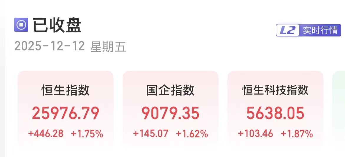 12月12日,港股三大指数飘红。截至收盘,恒生指数涨1.75%,报25976.79点;恒生国企指数涨1.62%,报9079.35点;恒生科技指数涨1.87%,报5638.05点。