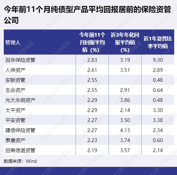 纯债型产品前11个月平均回报最高的是百年保险资管,前11个月平均回报为2.83%。百年保险资管有两只产品前11个月回报超4%,不过也有1只产品为负收益,表现较为分化。