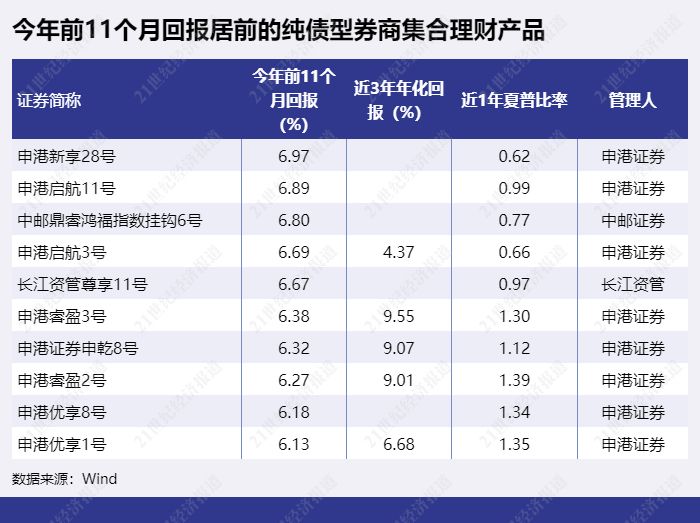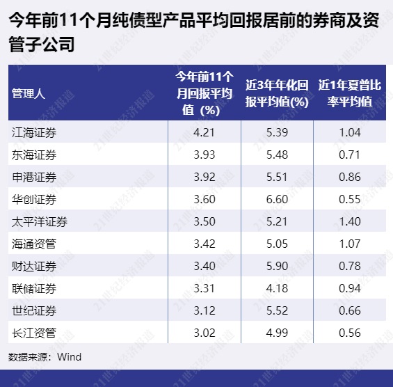 从券商及资管子公司的纯债型产品整体表现来看,不少机构纯债型产品前11个月平均回报已超过3%。