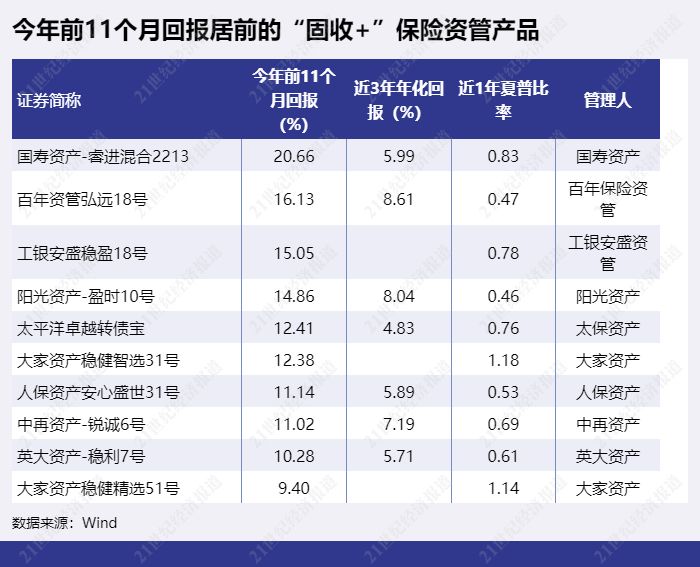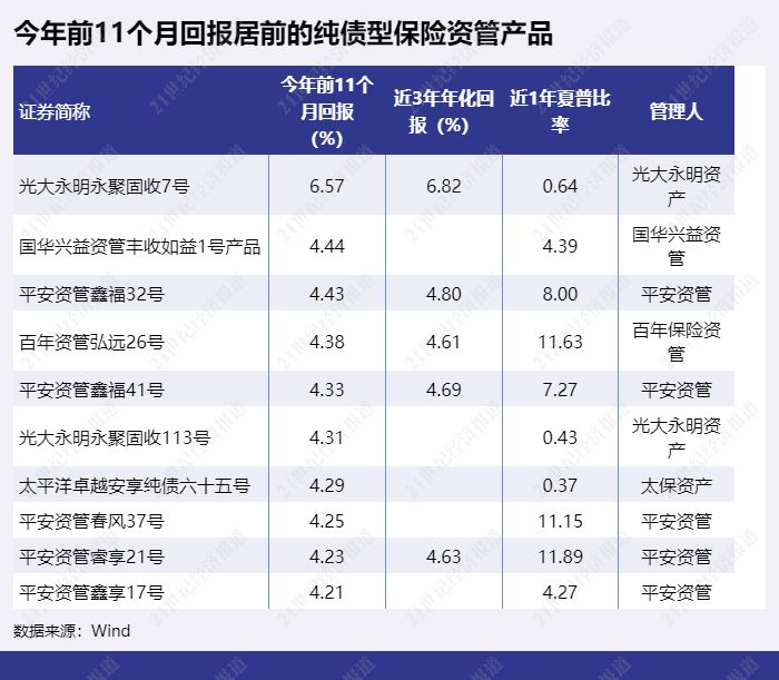 前11月回报排前十的纯债型保险资管产品略有变动,“光大永明永聚固收7号”以6.57%的收益率依然排第一,但11月回报为负。