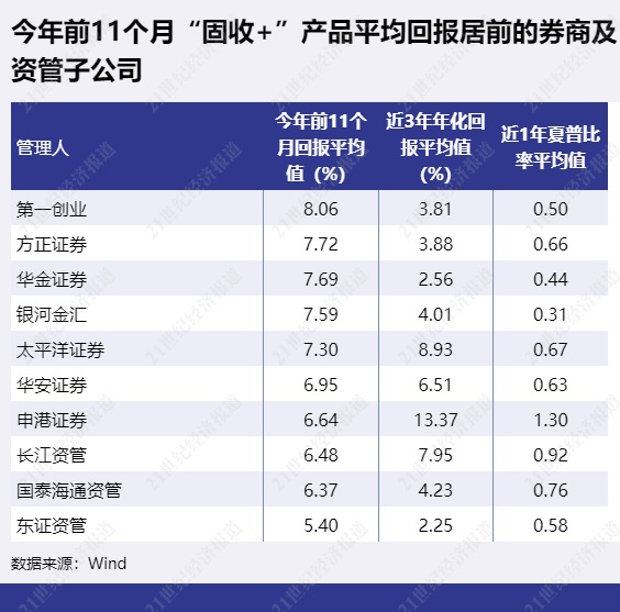 2、“固收+”产品:中航证券、国金资管、万联资管等平均回报排名靠后