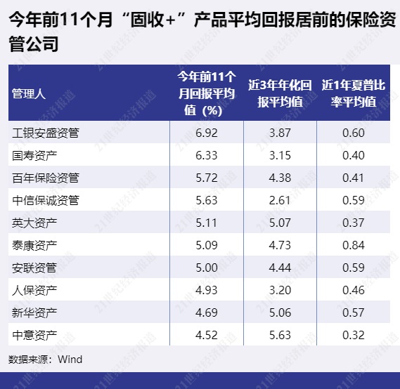 “固收+”保险资管产品前11个月表现最好的是工银安盛资管,今年前11个月平均回报为6.92%,不过工银安盛资管有前11个月回报数据的产品较少,仅3只。