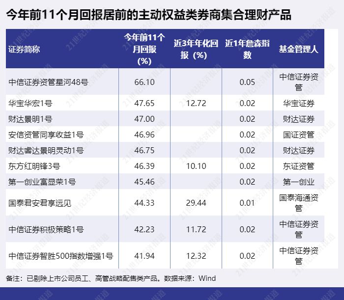 剔除后前11个月回报最高的权益类集合理财产品为“中信证券资管星河48号”,已实现66.1%的回报。排第二的是“华宝华宏1号”,前11个月回报为47.65%,“财达景明1号”以47%的收益率排第三。