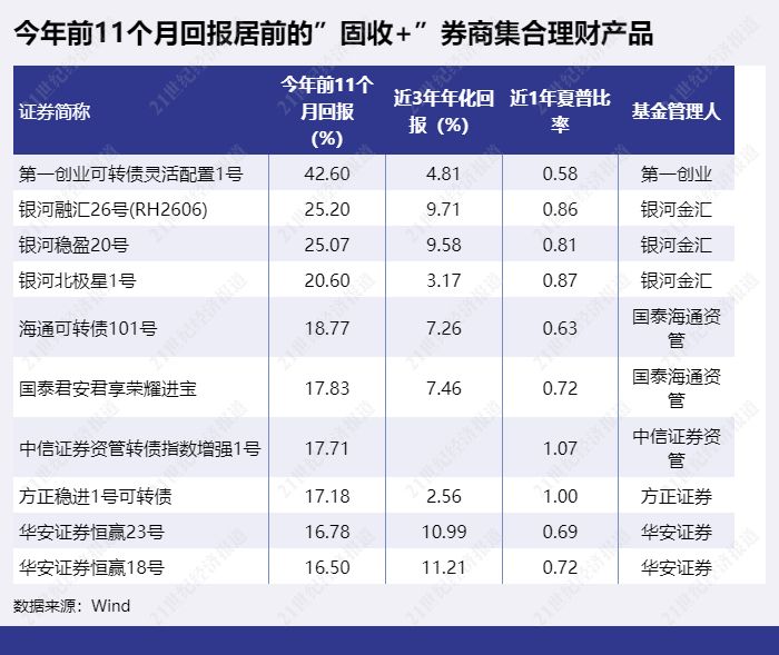 “第一创业可转债灵活配置1号”“银河融汇26号(RH2606)”“银河稳盈20号”依然排前三,前11个月回报分别为42.6%、25.2%、25.07%。其中“第一创业可转债灵活配置1号”今年三季度末主要配置国债和可转债。