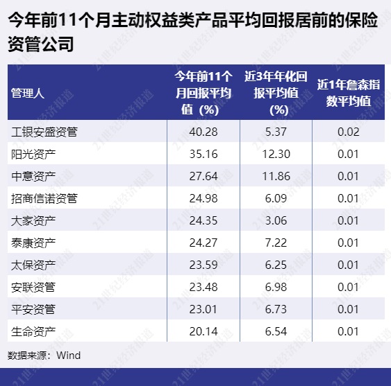今年前11个月保险资管公司的主动权益类产品平均回报有的相比前10个月继续增长,有的受股市震荡影响有所回落。平均回报最高的保险资管公司是工银安盛资管,平均回报为40.28%。国寿资产以6.33%的平均回报排第二,百年保险资管以5.72%排第三。
