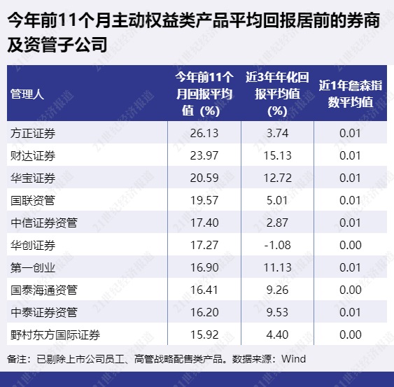 主动权益类集合产品前11个月表现较为突出的有方正证券、财达证券、华宝证券等,前11个月平均回报分别为26.13%、23.97%、20.59%。
