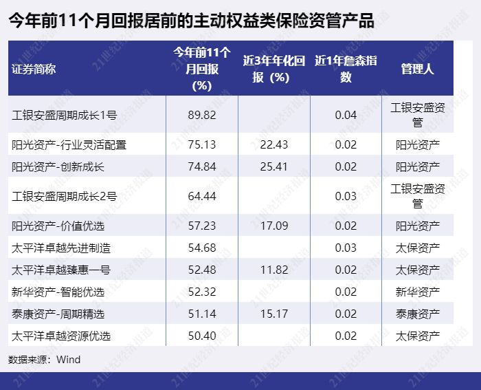 权益类保险资管产品虽然不少产品净值出现了回撤,但部分产品前11个月回报依然处在较高的水平。工银安盛周期成长1号前11个月回报89.82%,排第一,11月净值小幅下跌0.48%。