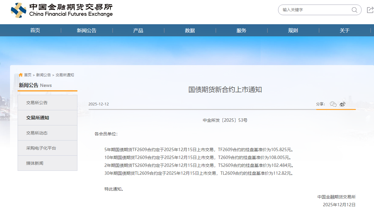 中金所12月12日发布国债期货新合约上市通知。具体如下: