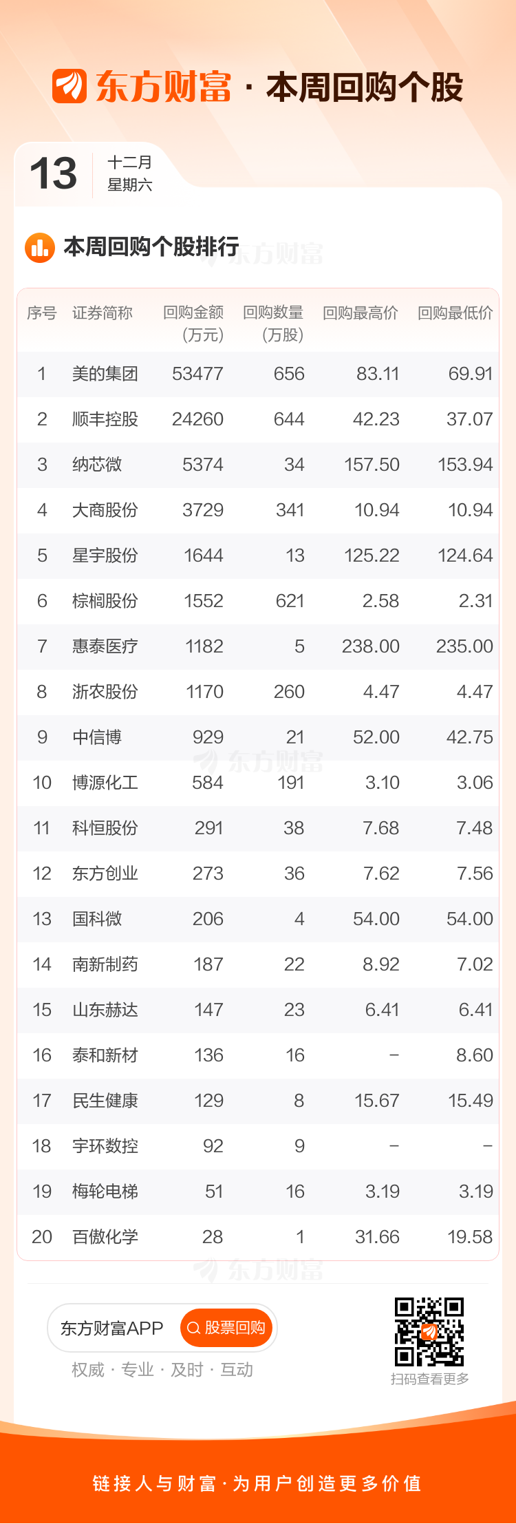 本周美的集团披露的回购金额最高,为5.35亿元,顺丰控股排名第二,为2.43亿元。
