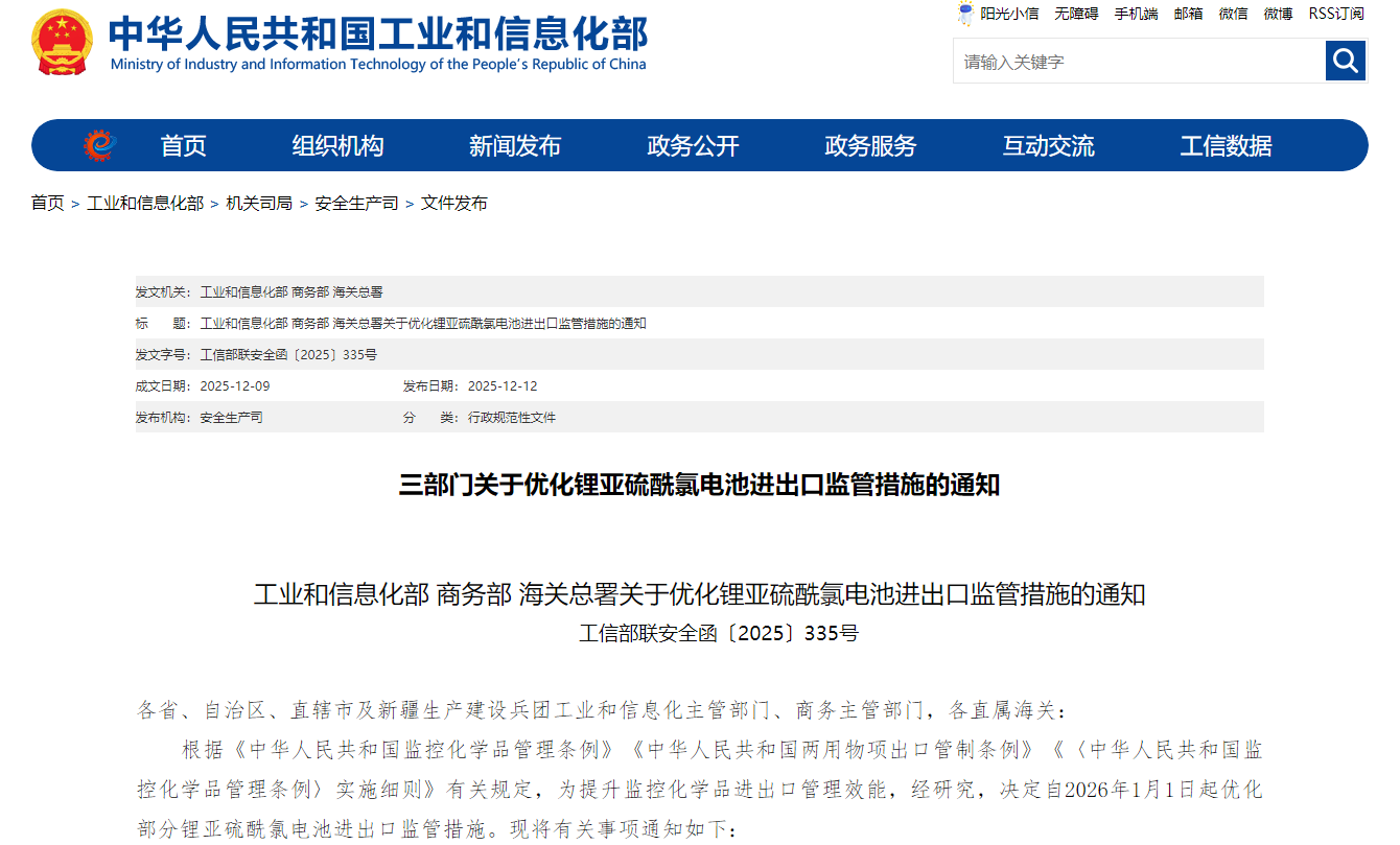 据工业和信息化部12月12日消息,为提升监控化学品进出口管理效能,经研究,工业和信息化部、商务部及海关总署决定自2026年1月1日起优化部分锂亚硫酰氯电池进出口监管措施。适用范围为第三类监控化学品亚硫酰氯(化学文摘社登记号:7719-09-7)灌装含量不超过1千克的单个锂亚硫酰氯电池或电池组。