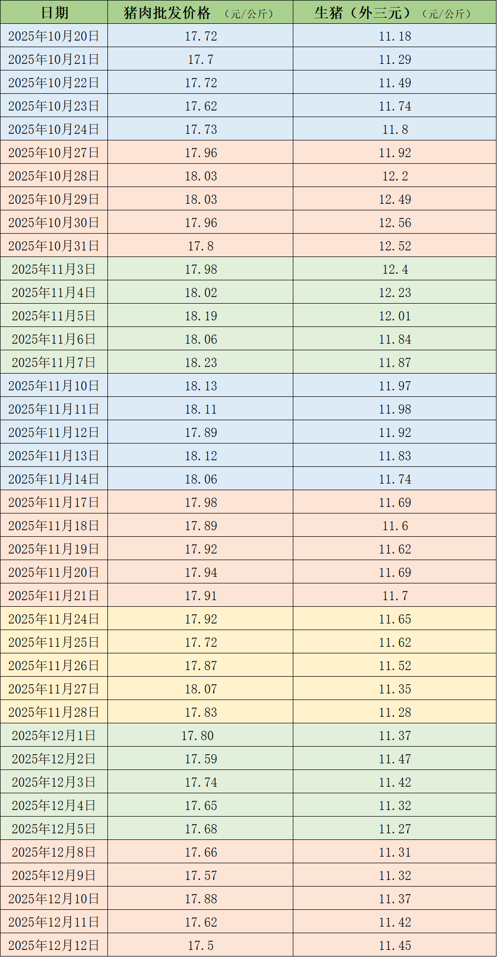 据农业农村部监测,12月12日,全国农产品批发市场猪肉平均价格为17.5元/公斤,与上周五(12月5日)的17.68元/公斤相比,下降1%。本周的平均价格为17.65元/公斤,与上周17.69元/公斤的均价相比,下降0.2%。