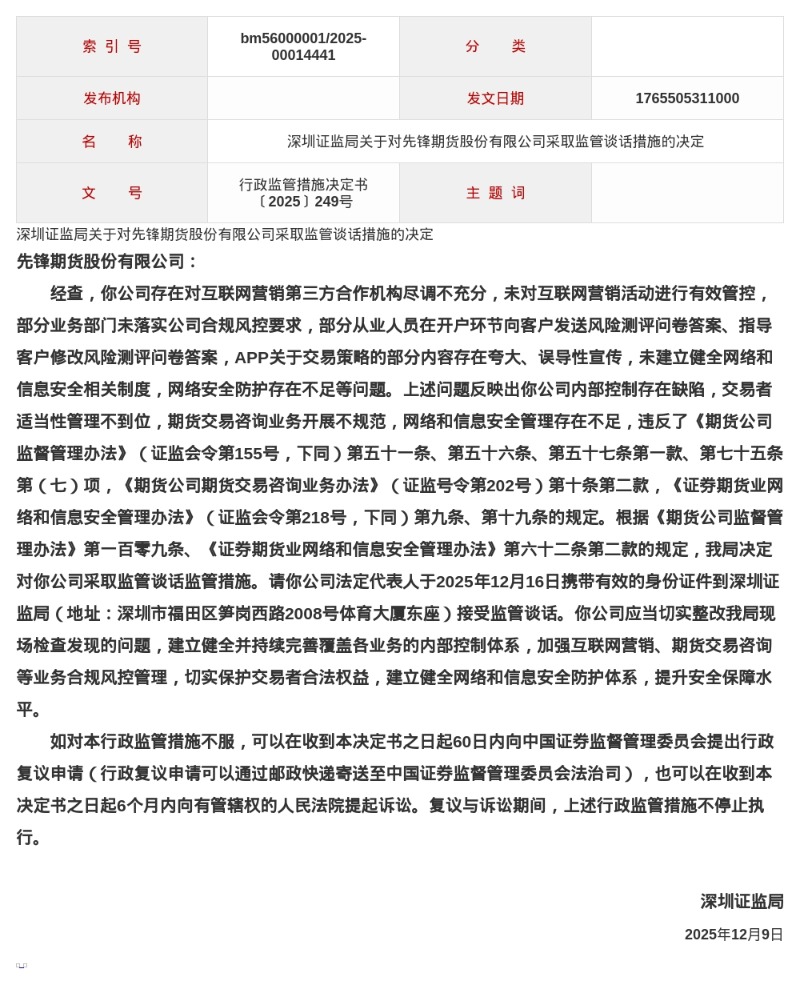 蓝鲸新闻12月13日讯,近日,深圳证监局发布了行政监管措施决定书,剑指先锋期货股份有限公司。