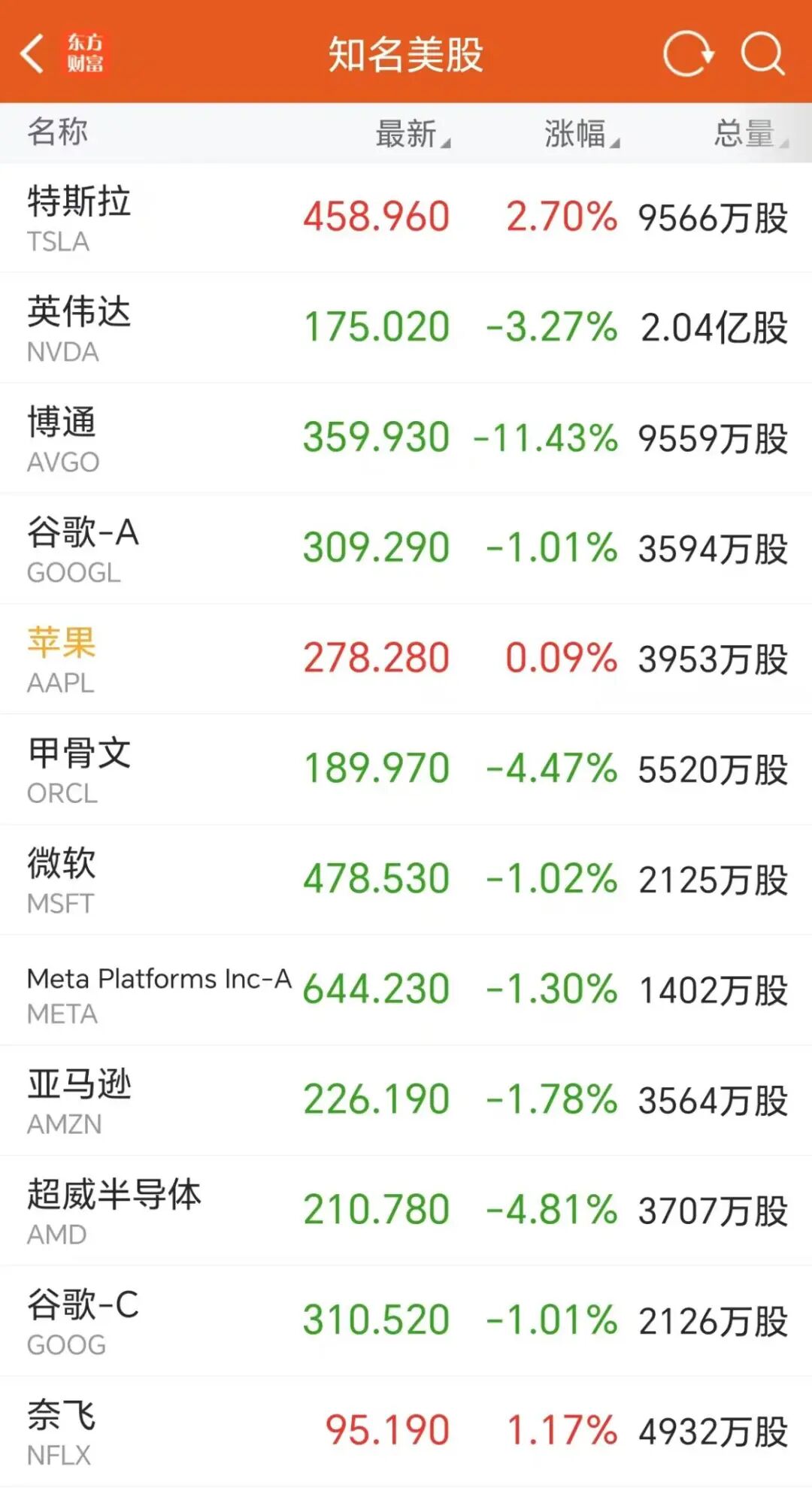 热门科技股普跌,博通跌超11%,英伟达跌超3%,谷歌、微软、Meta、亚马逊均跌超1%,特斯拉涨超2%。