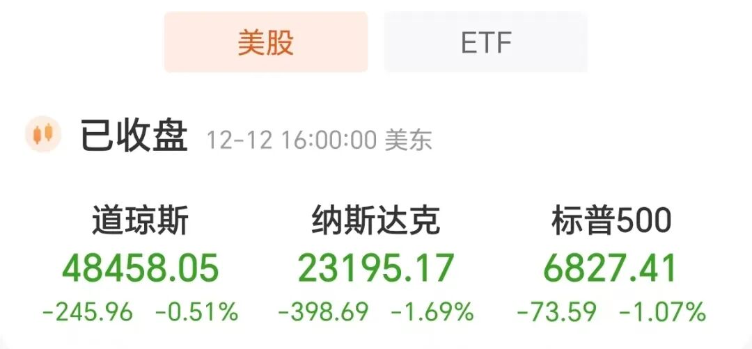 美股三大指数12月12日收盘全线下跌。截至收盘,道琼斯工业平均指数比前一交易日下跌245.96点,收于48458.05点,跌幅为0.51%,本周累计上涨1.05%;标准普尔500种股票指数下跌73.59点,收于6827.41点,跌幅为1.07%,本周累计下跌0.63%;纳斯达克综合指数下跌398.69点,收于23195.17点,跌幅为1.69%,本周累计下跌1.62%。