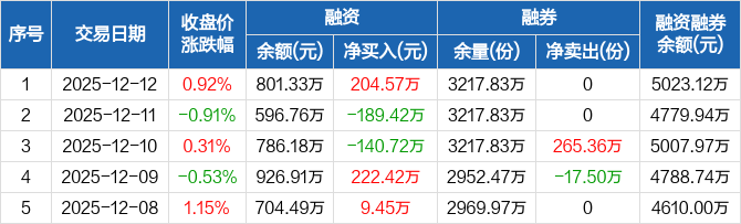 融资方面,当日融资买入374.2万元,融资偿还169.62万元,融资净买入204.57万元。融券方面,融券卖出0份,融券偿还0份,融券余量3217.83万份,融券余额4221.79万元。融资融券余额合计5023.12万元。